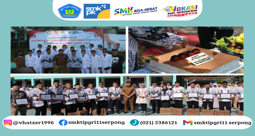 Serpong, 25 November - SMKS TI PGRI 11 Serpong mendapat kehormatan menjadi tuan rumah Upacara Peringatan HUT PGRI ke-80 dan Hari Guru Nasional Tahun 2025. Kegiatan berlangsung dengan khidmat dan meriah di halaman sekolah, dihadiri oleh berbagai unsur pendidikan di bawah naungan PGRI Kota Tangerang Selatan.